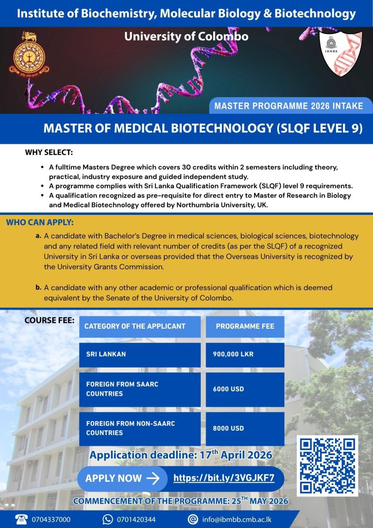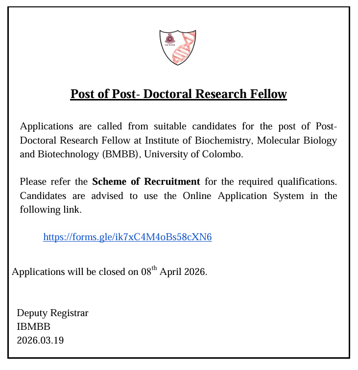 Application deadline: 17th May 2026Institute of Biochemistry, Molecular Biology and Biotechnology (IBMBB) is a Postgraduate Institution of University of Colombo.IBMBB commencing a Bachelor of…